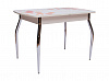 Столешница имеет размер 1 м 10 см, синхронно-раздвижной механизм “бабочка” позволяет увеличить ее еще на 30 см и увеличить количество посадочных мест. Материалы изготовления - ЛДСП, МДФ и закаленное стекло. В ассортименте варианты с цветным стеклом, с узором, с кожзамом, с фотопечатью и даже с искусственным камнем. Ножки могут быть гнутыми или прямыми, из хромированной стали или массива березы в одном из трех цветов - выбор комбинаций просто огромный.